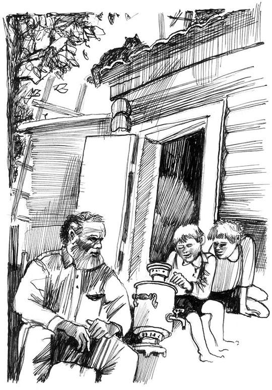* * *Дедушка только что вычистил самовар и, сидя на крылечке, поглаживая сияющее на полуденном солнце самоварное брюхо, рассуждает вслух: