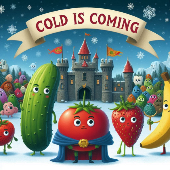 Once upon a time, in the magical kingdom of Freshville, the fruits and veggies were enjoying the warm, sunny days of summer. The fields were lush, and the markets were bustling with vibrant produce. However, one day, the wise old potato named Spud noticed a chill in the air.