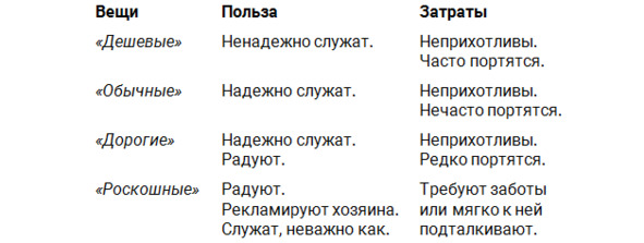 Вещи приносят пользу и влекут затраты на покупку и обслуживание. Прибыль от вещи – это ее польза минус все затраты на нее. А прибыль от имущества – общая польза минус общие затраты. Конечно, строгие расчеты невозможны, но, слегка задумавшись, мы представляем, положительную или отрицательную прибыль получаем от стакана и кастрюли.