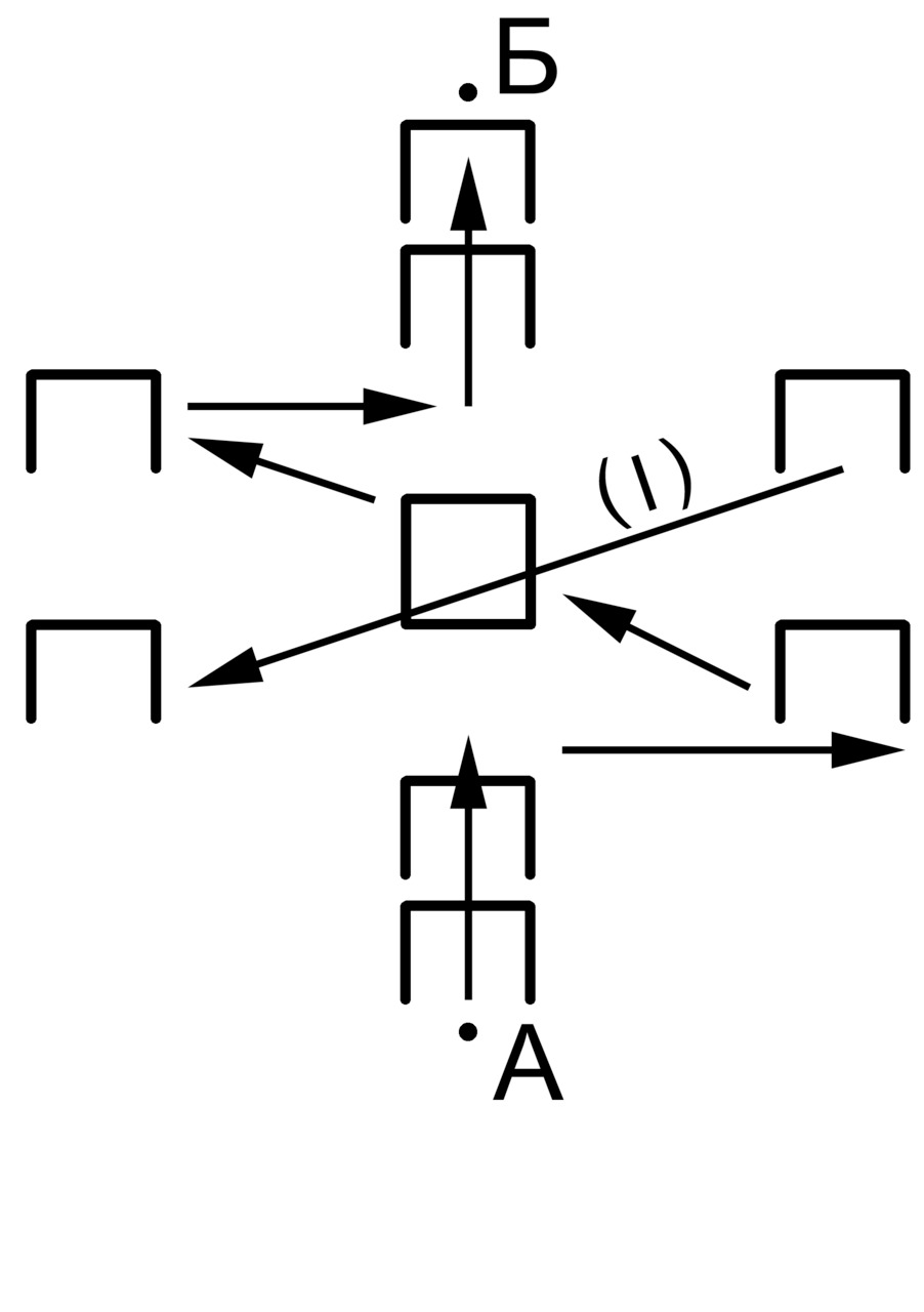 Так, доведя свой шар от фока А до фока Б, и пройдя через дужки-ворота и трудную, поставленную в центре «мышеловку» из 2-х перекрещивающихся ворот, надо было вернуться обратно, частично через те же дужки, но уже по другому краю площадки по стрелке (1). Ход – это удар по шару.