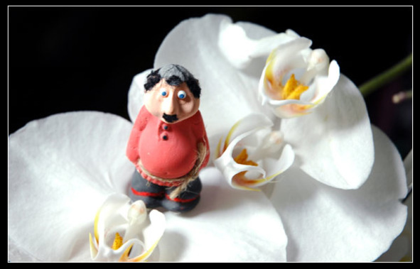 Однажды Дюймовочек поссорился с бутоном орхидеи, в котором жил, скрытый от глаз посторонних охальников. То ли вино красное пролил на белоснежный лепесток, то ли кусок шашлыка на столе забыл и тот стал ос привлекать. В общем, по той или иной причине, но цветок обиделся и распустился – посмотри, мол, свет, что за свинтус-грандиозус в моих недрах обитает. Взгляните и вы на лирического фотогероя. 1