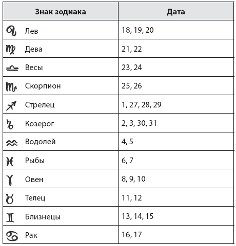 18 январяС (Козерог) 08:44–16:35, Л (Лев) (п) 16:32–09:43, л. д. 16,17