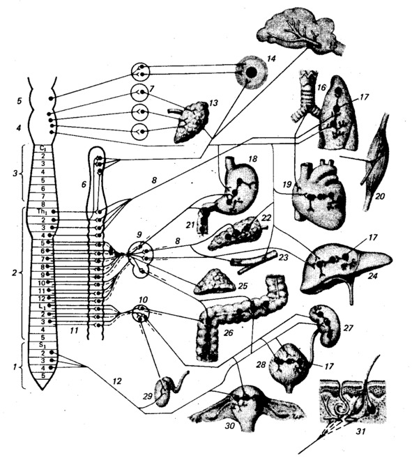 1 – Крестцовый отдел спинного мозга. S1-S5 – сегменты крестца. 2 – Грудной и поясничный отделы спинного мозга. Th1—Th12 – сегменты грудного отдела позвоночника. L1 – L5 – сегменты поясничного отдела позвоночника. 3 – Шейный отдел спинного мозга. C1- C7 – Сегменты шейного отдела позвоночника. 4 – Продолговатый мозг. 5 – Средний мозг. 6 – Поясничный симпатический ствол (паравертебральные ганглии). 7 – Парасимпатические узлы головы. 8 – Постганглионарные волокна. 9 – Солнечное сплетение и его узлы. 10 – Каудальное брыжеечное сплетение и его узлы. 11 – Преганглионарные волокна. 12 – Тазовый нерв. 13 – Слюнные железы. 14 – Внутренние мышцы глаза. 15 – Сосуды головного мозга и его оболочек. 16 – Трахеи, бронхи, лёгкое. 17 – Функциональные модули метасимпатической нервной системы. 18 – Желудок. 19 – Сердце. 20 – Скелетная мышца. 21 – Двенадцатиперстная кишка. 22 – Поджелудочная железа. 23 – Кровеносные сосуды внутренних органов. 24 – Печень. 25 – Надпочечник. 26 —Толстая кишка. 27 – Почка. 28 – Мочевой пузырь. 29 – Внутренняя часть мужских половых органов. 30 – Матка. 31 – Кожа.