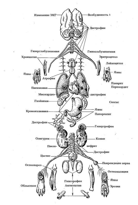 Рефлекторная теория трофического влияния нервной системы на ткани и рефлекторная теория нейрогенных дистрофий получили дальнейшее развитие в работах академика А. Д. Сперанского, его сотрудников и последователей. Раздражая седалищный нерв у собаки, исследователи получали картину множественных дистрофий (рис. 2.2). Язвы появлялись на противоположной задней конечности, передних конечностях, на слизистой рта и желудочно-кишечного тракта. Одновременно проявлялись дистрофии спинного мозга, гипоталамуса, превертебральных и паравертебральных ганглиев (нервных центров вблизи позвоночника), симпатической нервной системы. При повреждении седалищного нерва у животных могут возникнуть язвы на конечностях с неповрежденными нервами, долевые пневмонии, миокардиодистрофия, дистрофии эндокринных желез, нефрит, дисфункция и камни почек, остеопороз, остеомаляция, облысение на обширных участках кожи, контрактуры (спастические состояния мышц), параличи, дистрофия печени и т. п.