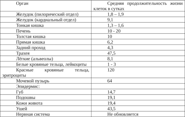 Таблица 2. Продолжительность жизни клеток разных органов человека