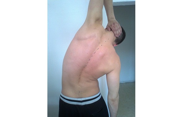 Рис. 3.4А. Пример измерения подвижности сегментов позвоночника. У спортсмена заблокированы верхнегрудной и среднегрудной отделы позвоночника. Данный спортсмен более года страдает болями в спине.