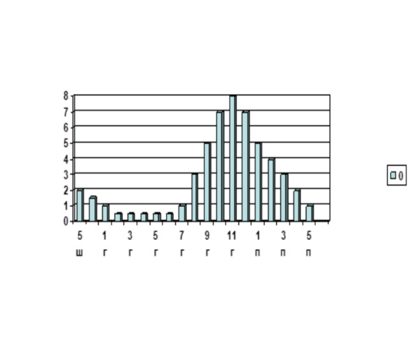 Рис. 3.5 Б. Диаграмма подвижности позвоночных сегментов в грудном и поясничном отделах позвоночника 2-го спортсмена. Суммарная (в обе стороны) подвижность позвоночника составляет 90 градусов. По оси ординат угол наклона в градусах. По оси абсцисс номера позвонков, обозначения: ш – шейный, г – грудной, п – поясничный отделы позвоночника.
