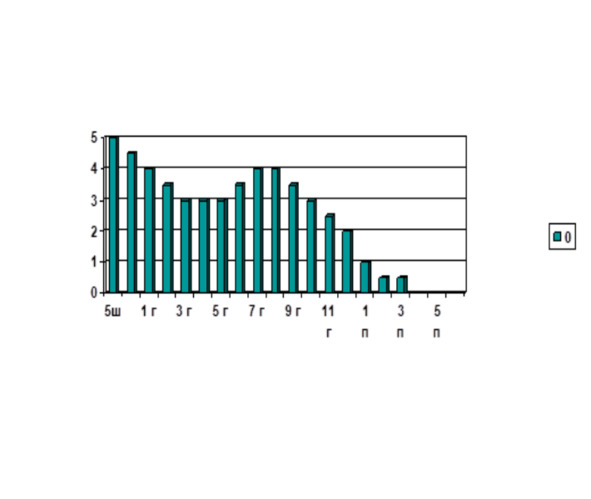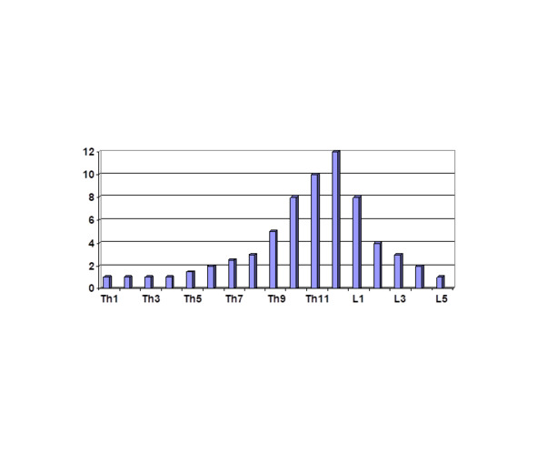 У большинства обследованных лиц, имевших боли в позвоночнике, были обнаружены области с пониженной подвижностью или полной неподвижностью сегментов позвоночника. Рядом с ними, как правило, имелись области с гиперподвижностью позвонков, которые создавали обманчивую картину гибкости всего позвоночника. Человеку может казаться, что он, выполняя физзарядку, работает всем своим позвоночником. На самом деле он гнётся только в одном «расшатанном» отделе и не может равномерно и правильно работать всем позвоночником. На рис. 3.2 приведён пример результата обследования подвижности сегментов позвоночника с построением диаграммы подвижности двигательных сегментов позвоночника рис. 3.3. Обследуемая – девушка 17 лет, имеет гиперподвижность в нижнегрудном отделе и практически полную блокаду в верхнегрудном отделе позвоночника.