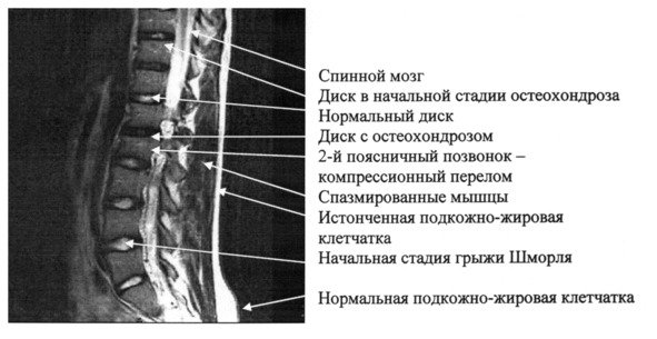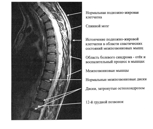 В области позвоночника с хорошими дисками межпозвонковые мышцы жировых прослоек не имеют, а их структура имеет более тёмную текстуру, чем нормальные мышцы. Это является признаком высокой активности мышц, воспалительного процесса в мышцах или отёка. Именно в этой области пациент испытывает боль, а не там, где имеется остеохондроз или грыжа диска. Напомним, что целью МРТ обследования было обнаружение причины болей в пояснице. Медицинское заключение о причинах болевого синдрома оказалось не верным.