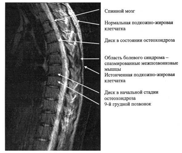 Рассмотрим снимок ещё одного нашего пациента, мужчины 23 лет спортсмена – футболиста с сильными болями в среднегрудном отделе позвоночника (рис. 3.10). Диск между 8-м и 9-м грудными позвонками имеет сниженную толщину и разрушенное пульпозное ядро. Это состояние остеохондроза. Диски между 5-м и 6-м, а также между 8-м и 9-м позвонками имеют начальную стадию остеохондроза. Боли в среднегрудном отделе позвоночника у этого пациента длятся уже около трёх лет и вызваны спастическим состоянием межпозвонковых мышц, сопровождающимся воспалительным процессом – миозитом. Этот вывод сделан на основе мануальной диагностики и проведенного нами лечебного массажа. Начальные дистрофические явления в дисках – следствие 3-х летних спастических состояний.