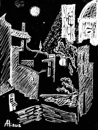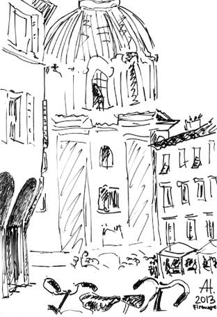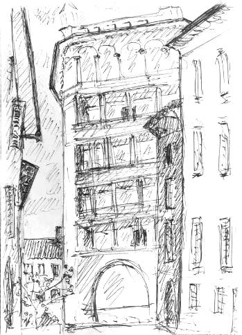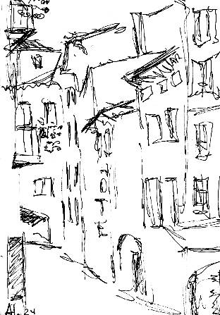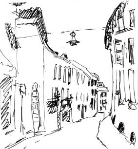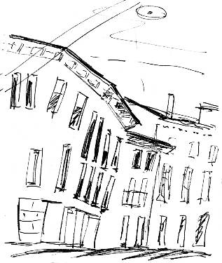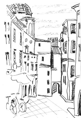 Эти соображения и привели к сознательному планированию кривых или, как теперь говорят, синусоидальных улиц с домами, естественно вписывающимися в эту кривизну с помощью уникального приёма ломки плоских фасадов под тупым углом в 160–170 градусов. Такие улицы я встречал и с особым воодушевлением рисовал в городах Италии, когда мне доводилось замедлить свой бег с тем, чтобы, не торопясь вынуть из рюкзака лист белой бумаги на твердой подложке и карандаш, а чаще чёрный маркер, и погрузиться в свой почти непрекращающийся диалог с видимым миром.