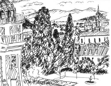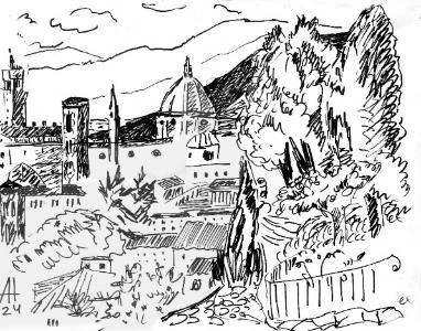 В последней работали художники XIV и начала XV века с редко упоминаемыми, а иногда и неизвестными сегодня именами, держа оборону против мирских соблазнов: перспективы и имитации трехмерности, как у Микеланджело, декоративности Боттичелли и почти фотографического реализма последующих поколений. Эта церковь, заложенная в глубоком Средневековье, подверглась реновации в виде мраморного фасада и капеллы португальского кардинала в начале Возрождения, но в течение ещё многих веков жила своей обособленной жизнью на холме за рекой Арно, с которого можно было бесстрастно наблюдать бурный рост Флоренции как коммерческого предприятия, а потом и туристической «мекки». Но к последнему моему приезду кое-что изменилось. Переполненная толпами туристов Флоренция требовала расширения места для развлечения и обслуживания посетителей со всех концов света. Таким образом, и на самом холме возникли новые парковые структуры, стоянки машин и комплексы общепита, вскоре заполненные до отказа невесть откуда взявшейся публикой. Церковью и её внутренним убранством, как и прежде, интересуются немногие. Да и местные служители культа ограничивают посещение несколькими часами до и после Мессы. К закату, то есть ко времени ужина, однако, людей остаётся меньше, и они достаточно плотно рассаживаются на крутом холме для лицезрения Флоренции в наступающих сумерках, когда спадает жара и боковой свет делает различимыми в хаосе городского пейзажа его основные черты: купол Санта-Мария дей Фьёре, Кампаниллы Джотто, круглой крыши капеллы Медичи и башни Палаццо Вехьо на фоне темнеющих гор и всё ещё светлого неба.