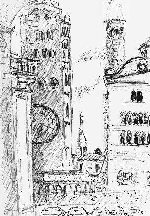 Нереально высокая и прямая квадратного сечения колокольня и кирпичные цилиндрические столбы по сторонам, выступающие из-за добавленного позже фигурного барочного фасада, намекают на немецкое происхождение этого комплекса в соответствии со вкусом первых заказчиков. В 16 веке, естественно, прибавился белый фасад в один кирпич толщиной, стены и потолки, сплошь разрисованные богатыми и мастерски написанными, но до декоративности бесстрастными фресками. А ведь на полтора столетия раньше в тогдашнюю окраину перебрались, подальше от социальных и военных потрясений, художники из числа гениев, таких, как упоминавшийся ранее «Мастер Пармского Баптистерия» и прозванный в своё время королём живописцев Пьеро Делла Франческа, нашедший себе знатного покровителя – воинственного хозяина Римини – Сигизмондо Малатесту. Последний, войдя в историю в качестве даже по тем временам жестокого диктатора, покровительствовал искусствам (возможно в пику церковному аскетизму) и был увековечен вместе со своей собакой на стене главного собора Римини одной из наиболее известных фресок Делла Франчески. Собор этот, выглядящий на удивление современным, с геометрически чистыми обводами, построен под руководством великого Леона Баттисты Альберти, о котором уже шла речь.