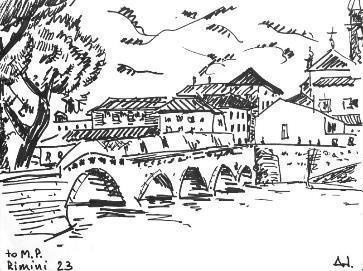 Их соединяет изначально прямая, мощённая камнями дорога Августа для беспрепятственного передвижения легионов. Но часть её приобрела синусоидальность в результате более позднего строительства. В том самом месте, где кончаются изгибы, уступая прямизне римского идеала, в углу центральной торговой площади поставлена указом Муссолини бронзовая статуя Юлия Цезаря, может быть, на том самом месте, где он сказал своё «Жребий брошен» за 50 лет до Рождества Христова.