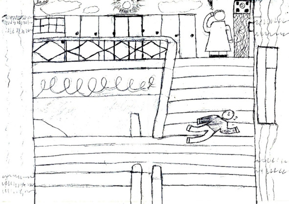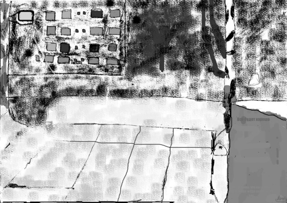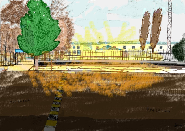 Пройдя за ворота, оказалось, что на площадке рядом с кольцом, играли в баскетбол. А за ними наблюдали маленькие паучки, которые сидели на маленьком заборе. Проходя дальше, он заметил ребят, играющих в футбол. Все они, всего лишь медленно двигались, из-за чего напомнили, как часто мы играли в эти игры.