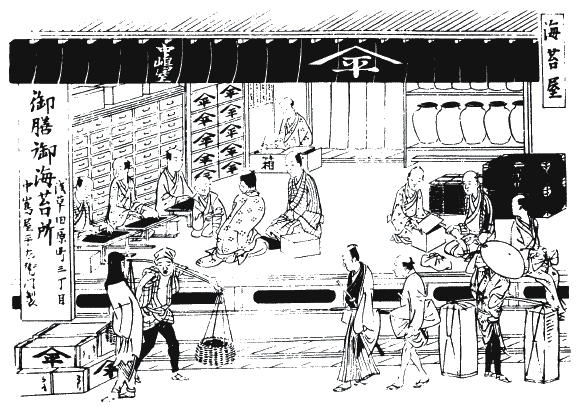 Рис. 1. Самурай на улице. Самурай, носящий два меча, в сопровождении слуги с ношей, завернутой в традиционный шелковый платок (фуросики), идет мимо лавки, торгующей водорослями. Мужчины слева режут сушеные водоросли, которые в Японии едят с рисом. Над входом – норэн (ткань, защищавшая помещение от пыли и служившая символом независимости предприятия) с надписью «Накадзима-я». Старший продавец вносит записи в бухгалтерскую книгу.