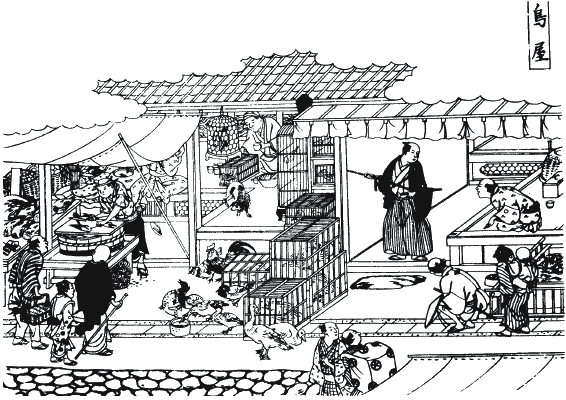 Рис. 2. Самурай у торговца домашней птицей. Он выходит из лавки и вкладывает в ножны свой большой меч, который вытаскивал, чтобы удобно было сидеть, пока он улаживал свои дела с владельцем лавки. Последний подобострастно провожает гостя из помещения на улице; у лавки слуга самурая в кимоно, подоткнутом сзади за пояс, терпеливо поджидает своего хозяина.