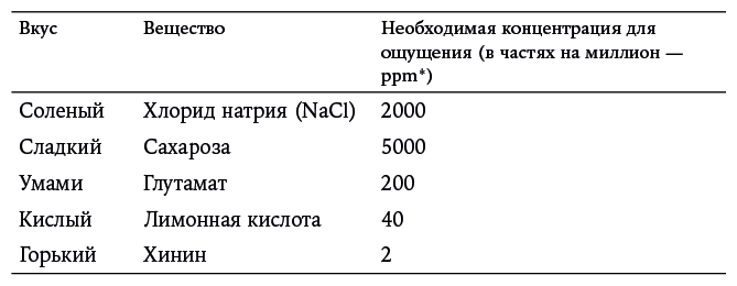 Минимальная концентрация вещества, необходимая для возбуждения вкусового рецептора, значительно варьирует в зависимости от вида рецептора. Рецепторы горького вкуса обычно реагируют на «свое» вещество, например хинин – ядовитый алкалоид, вырабатываемый растениями, даже если его концентрация невелика. Эти рецепторы возникли в ходе эволюции, чтобы предупреждать нас об опасности, и лучше всего, если это сработает до того, как мы проглотим много чего-то неподходящего, попавшего нам на язык. С другой стороны, сахар полезен в больших концентрациях, и наш язык даже не определит, что ему попалось что-то сладкое, если концентрация этого вещества будет низкой. Остальные вкусовые рецепторы занимают место где-то посередине. Рецептор кислого вкуса – самый необычный из рецепторов и заслуживает специального рассмотрения, поэтому мы еще вернемся к нему в главе 7. Приведенные здесь данные получены при изучении большой группы людей. Однако эти пороговые значения различаются как для разных видов животных, так и для отдельных людей.