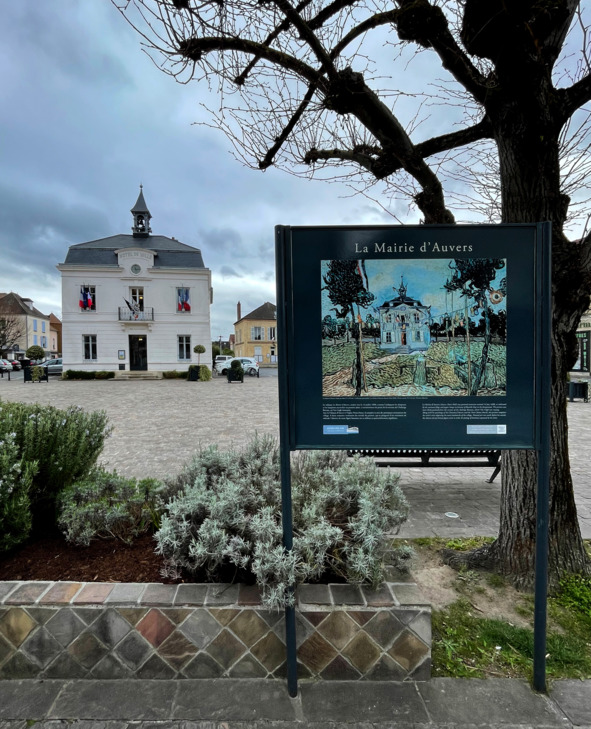 Ван Гогу нравился Овер. Помните: соломенные крыши, лиловый цвет? Мы крутили головами, но соломенных крыш не видели. Лилового было немного, больше серо-синего от хмурого неба. У мэрии остановились. Полотно со зданием мэрии мы знали. Для тех, кто не знает, на тротуаре стояла панель с копией картины. За 130 лет здание не изменилось. Я стоял и чувствовал, как бьется сердце. Ведь если я повернусь, то увижу гостиницу Раву, где прошли последние дни Ван Гога.