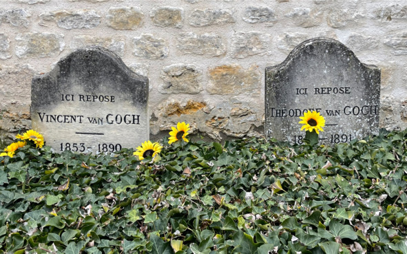 Ограда казалась бесконечной. Мы решили попросить помощи у рабочих, которые ремонтировали ворота. Вернее, они ничего не ремонтировали, а с интересом наблюдали за нами. Хорошо, когда с тобой спутница, говорящая по-французски. Услышав вопрос, рабочие закивали, но не стали показывать пальцем направление, а пошли с нами. Вчетвером подошли к могиле. Помолчали. Скромные плиты, скромные слова: «Здесь покоится Винсент ван Гог», «Здесь покоится Теодор ван Гог». Вспомнил, что у Бога нет мертвых. Не надо говорит «умерший», лучше «усопший». Над братьями растут подсолнухи. Радостные, золотые. Как на картинах Ван Гога.