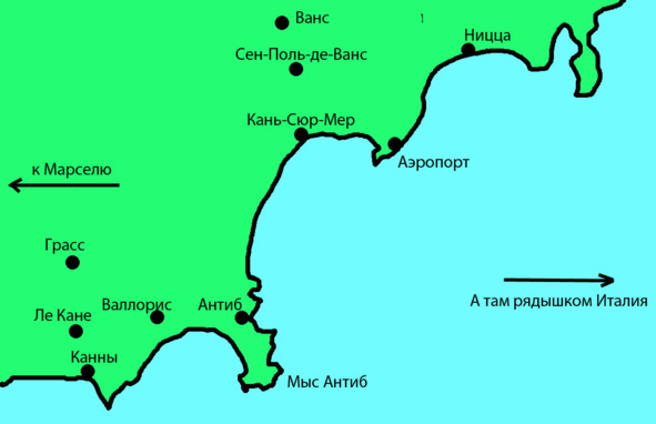 Ехали долго – ловили красный свет на всех светофорах и любовались ремонтом улиц в городке Кань-Сюр-Мер. Иногда за окном сверкало море, но чаще мелькали скучные дома, серые заборы, усталые женщины и реклама Кока-Колы. Синяя точка на телефонном навигаторе ползла на запад, приближаясь к Антибу.