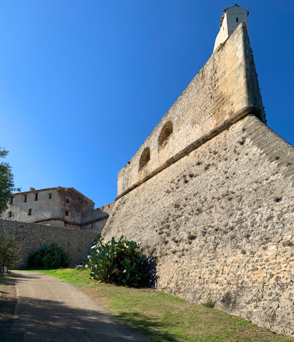 Мы стоим на стене форта Карре. Форт на границе Антиба, дорога к нему идет вдоль бухты со знаменитым портом Вобан. Форт – красавец. Особенно впечатляют спутниковые фотографии – величественная звезда с четырьмя лучами-бастионами. XVI-й век. Раньше форт служил для охраны границы между Королевством Франции и итальянским графством Ницца. Антиб был последним французским портом перед этой границей.