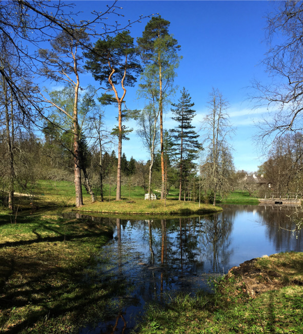 Усадьба в Михайловском восстанавливалась с нуля несколько раз. Подлинными являются только веточки и травинки (см выше). В Михайловском и Тригорье прекрасно. Особенно сейчас, в мае, когда Сороть разлилась, превратив долину в веселую смесь голубого и зеленого. Березы над голубизной обозначили русскость пейзажа, а сосны, дубы и вязы парка создали тень, предлагая заняться воспоминаниями того, что ты никогда не видел. Долина Сороти была потом. Сначала мы с гидом остановились у верхнего пруда в парке.