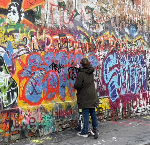 Наконец я увидел мастера граффити за работой! Работают мастера быстро. Подъезжают на самокате, достают баллончик с краской, пятнадцать секунд и шедевр готов. Ничего, что на стене Цоя на Арбате уже 150 слоев шедевров. Надо успеть сказать свое слово. Оно ведь самое важное, потому что последнее.