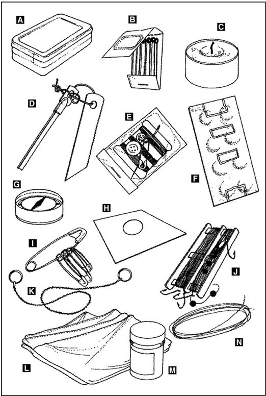 Ваш несессер (А) должен вмещать в себя следующее: коробок спичек (В) (лучше охотничьих) для использования лишь в том случае, если другие методы добывания огня недоступны, свечку-плошку (С) – источник огня и света, а также полезную вещь для разжигания костра, кремень с кресалом (D) – такое простейшее огниво может быть использовано несколько сотен раз и очень полезно, когда кончаются спички, швейные принадлежности (Е) для починки одежды и других целей, таблетки для очистки воды (F), применяемые, когда качество воды вызывает подозрения, а кипячение недоступно, компас (G), лучше с жидким наполнителем (проверяйте его регулярно на предмет протечек), зеркальце (Н) для подачи сигналов, несколько английских булавок (I), которые можно использовать для фиксации элементов одежды или при изготовлении импровизированной уды, рыболовный набор – моточек лески, несколько крючков и грузил (J), при этом намотайте как можно больше лески – ее можно использовать для изготовления птичьих силков (см. главу о еде), пилку-перетяжку (К) – ею можно валить даже относительно толстые деревья, хранить ее лучше завернутой в промасленную бумагу для предохранения от ржавчины, большой крепкий полиэтиленовый пакет (L), который можно использовать в качестве ведра для воды или для получения воды в испарительной или вегетационной установке, пузырек марганцевокислого калия (М) для дезинфекции и профилактики/лечения кишечных расстройств, а также моток проволоки (лучше медной) для силков на мелких животных (N).