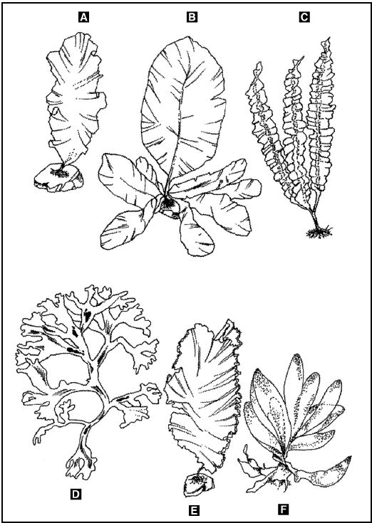 ВОДОРОСЛИ (рис. 21). Съедобные водоросли можно отыскать на мелководье – они крепятся к рифам, подводным камням или просто свободно плавают в толще воды. Морской салат (А) имеет нежно-зеленый цвет, бурые водоросли (В) обычно буровато-зеленые или оливковые, ламинария (С) имеет длинные плоские желтовато-коричневые космы, ирландский мох (D) растет красноватыми или оливково-зелеными космами, красно-бурые водоросли (Е) имеют коричневатую или близкую к пурпурной окраску, морская капуста (F) имеет красную, пурпурную, коричневую или синюю окраску.