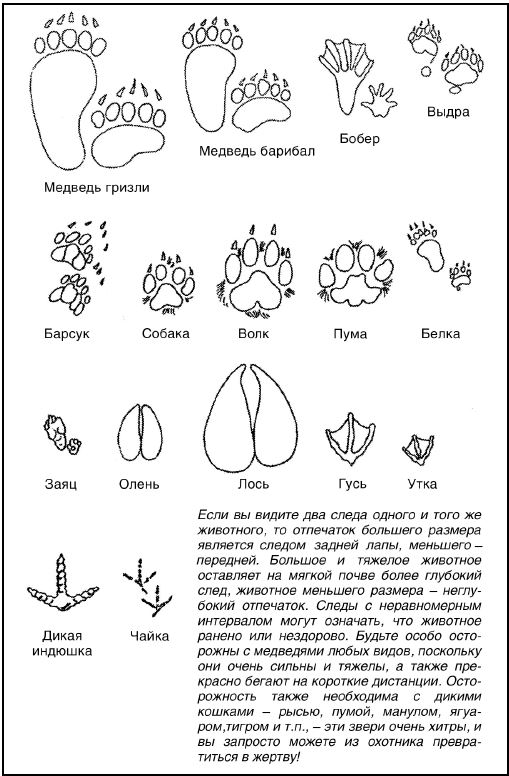 Если изображены два образца следа для одного и того же животного, отпечаток большего размера является следом задней лапы, меньшего – передней. Большое, тяжелое животное оставляет на мягкой почве более глубокий след, животное меньшего размера – неглубокий отпечаток. Следы с неравномерным интервалом между ними могут означать, что животное ранено или нездорово. Будьте особо осторожны с медведями любых видов – они очень сильны и тяжелы, а также прекрасно бегают на короткие дистанции. Осторожность также необходима с дикими кошками – рысью, пумой, манулом, ягуаром, тигром и т. п. – эти звери очень хитры, и вы запросто можете из охотника превратиться в жертву.