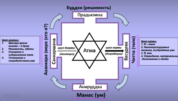 1) «Цикл деградации человека, или души начинается с того, что атма (душа) инстинктивно отождествляет себя с читтой. Читта находится непосредственно рядом с атмой.