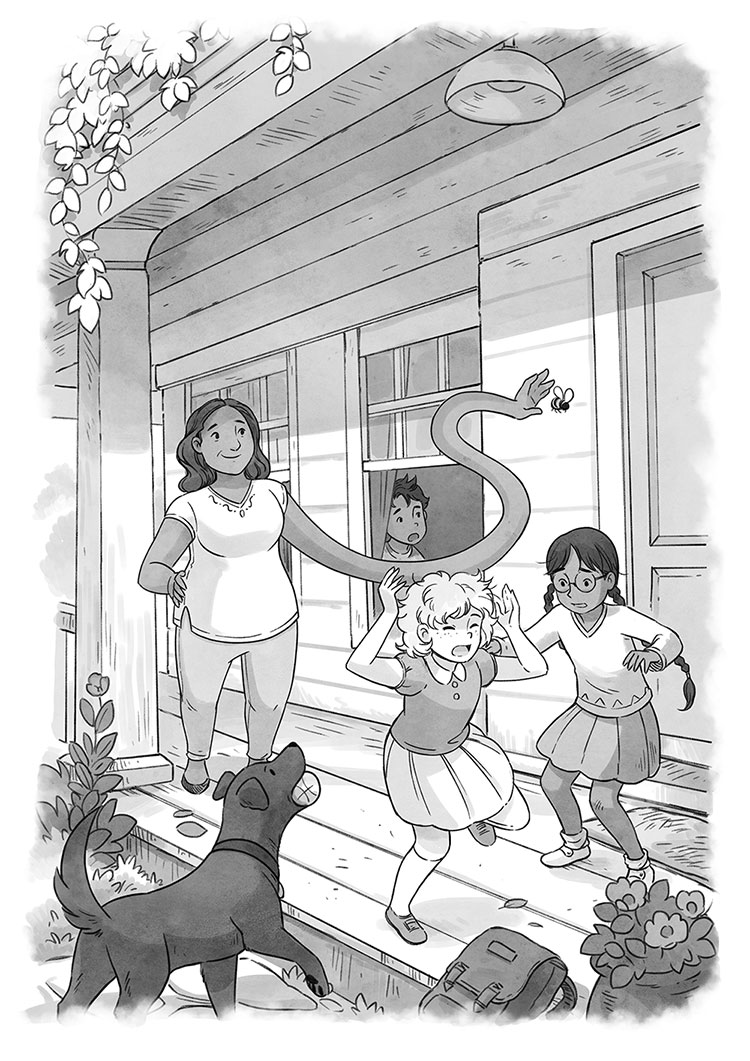 Но она не просто протянула руку, как делает обычная мама, чтобы достать, например, стакан с верхней полки. Нет. Мамина рука раскаталась, как длинный пожарный шланг. С одной стороны крыльца она достала до другой, где верещала Лола, и схватила мелькавшее насекомое. Потом, сойдя с крыльца, она шепнула что-то в кулак. Улыбнувшись, Ма раскрыла ладонь и выпустила пчелу прочь.