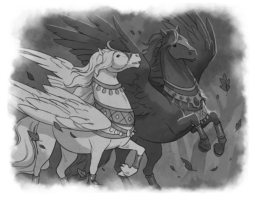 Они были огромны. Неимоверного размера крылья росли из спин самых больших коней, которых Кинджал когда-либо видел. Один белый, другой полуночно-чёрный, почти невидимый в тени деревьев. Оба были размером с небольшую гору и выглядели точь-в-точь как летающие кони-пакхираджи в книге народных сказок Па «Тхакурмар Джули».