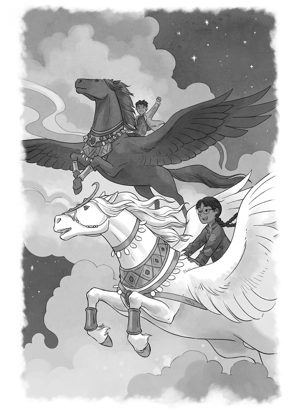 Затем, без всякого предупреждения, лошади оттолкнулись от земли мощными ногами, взмахнули крыльями и взмыли в ночное небо.
