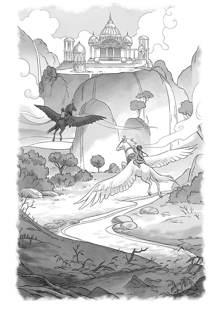 Но когда они приземлились на вершине Небесной горы, у кристально чистого Небесного озера (в названиях у пакхираджей явно была своя система), что-то пошло не так. Прежде всего их вышла поприветствовать вовсе не принцесса Пакхирадж. Встречала их сердитая рыжевато-коричневая крылатая лошадь в позолоченных доспехах и шлеме цвета тёмной крови.