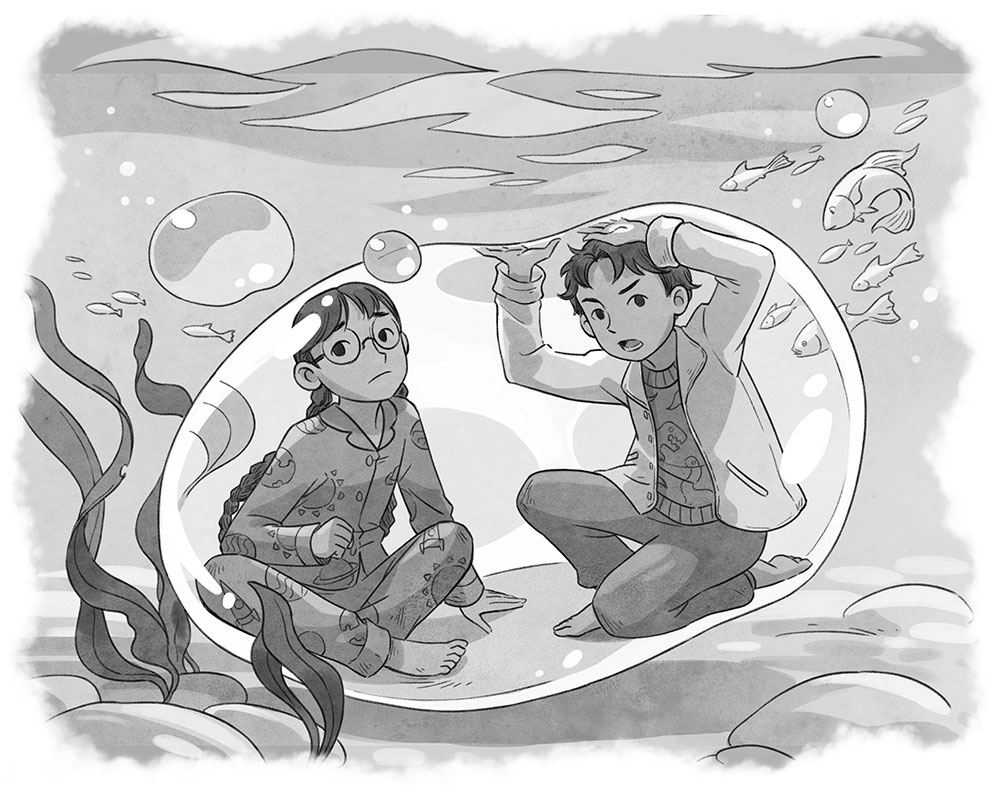 Двойняшки сидели, скрестив ноги, внизу пузыря – в нём не хватало места, чтобы стоять. Там, на счастье, был пригодный для дыхания воздух, но было странно видеть всё происходящее на поверхности снизу. Звуки до них не доносились, но они видели, что Снежок и Раат пытаются спорить с генералом.
