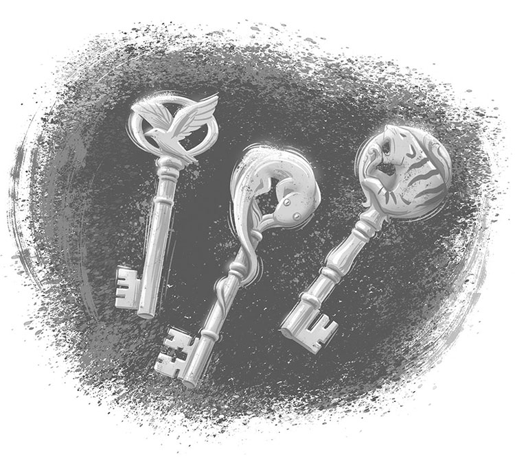 Ключи на полу задёргались и зазвякали, словно требовали, чтобы я продолжала разгадывать загадку. Подняв их с пола, я заметила, что головка одного ключа украшена изображением тигра, а двух других – фигурками птицы и ящерицы.