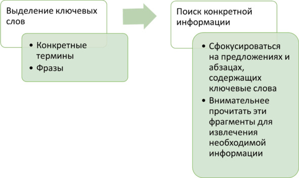 2. Поиск конкретной информации. Используя выделенные ключевые слова, читатель может просмотреть статью (scanning), сосредоточившись на поиске конкретной информации, связанной с поставленным вопросом исследования или сформулированным тезисом. Он может сфокусировать внимание на предложениях или абзацах, содержащих ключевые слова, и вдумчиво их прочитать для извлечения необходимых данных (рисунок 6).