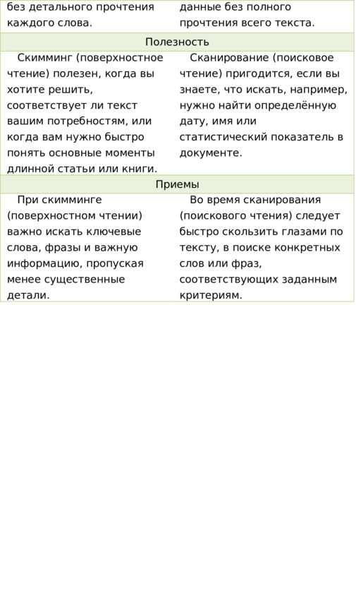 а) не полагайтесь только на скимминг или сканирование. Хотя они помогают быстро находить важную информацию, эти техники нельзя считать единственным методом чтения. Важно сочетать их с такими стратегиями, как: