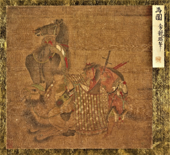 Музыкальный инструмент укладывается в сумку. 13 век. Любимый оркестр Чингис-Хана, который путешествовал вместе с ним, был из Тангута. Китайская тушь, изображающая всадника с лошадью и верблюдом. Картина написана неизвестным художником около 1271—1368 гг., когда в Китае правила Могуллская династия Юань, основанная Хубилай-ханом.