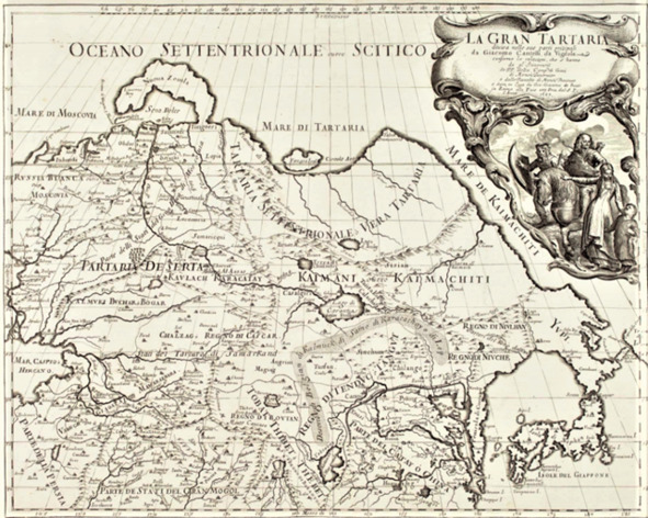 Итальянская карта Татарии XVII века ДЕ РОССИ, Джованни Джакомо. Рим, 1683 г. Карта Татарии Кантелли да Виньола, опубликованная в Mercurio Geografico. Япония изображена справа, и только узкий пролив отделяет её от материкового полуострова на севере. На большом титульном картуше изображена татарская семья.