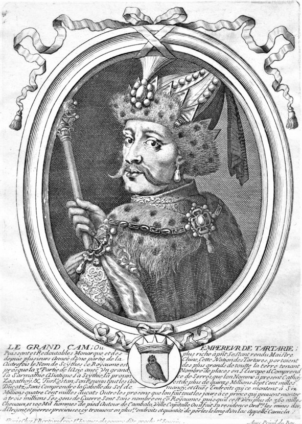 Великий Хан Великой Татарии. В нижней части один из гербов Великой Татарии. Средневековая графика.