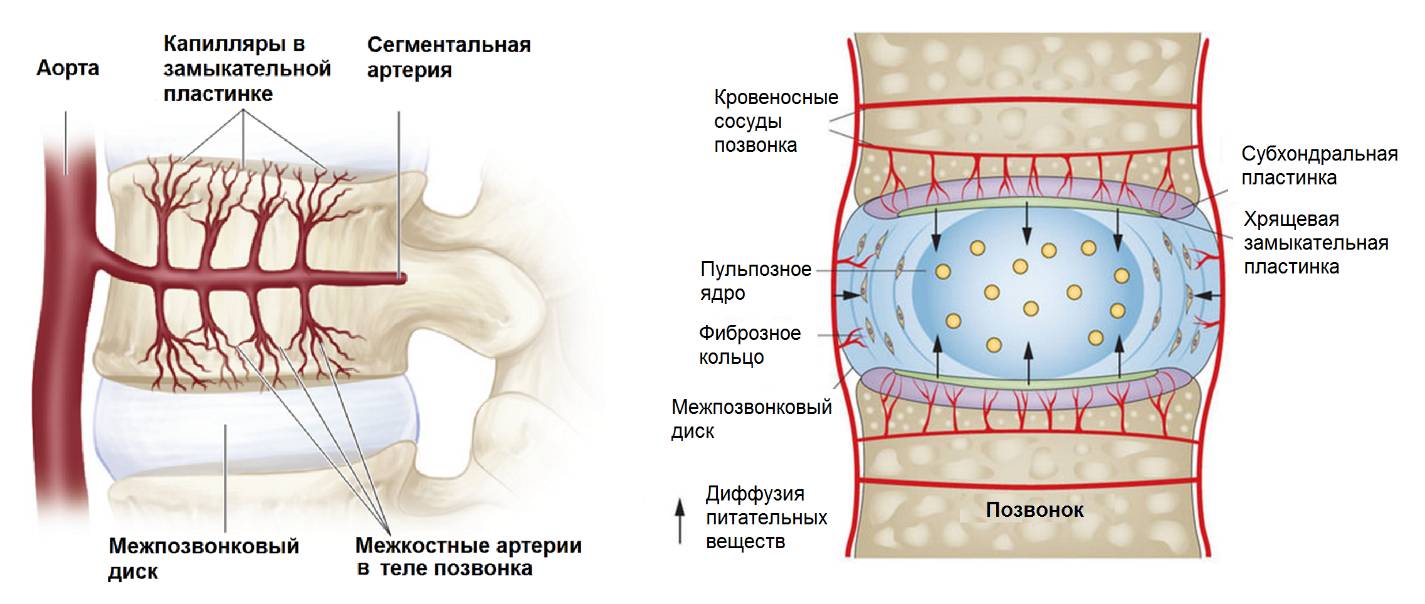 Для проведения питательных веществ через мембранный механизм замыкательной пластинки затрачивается около 2 часов (в среднем на 0,7 мм толщины пластинки) сквозь мембрану и еще около 4-5 часов транспортировки в центр диска. В среднем, в здоровом диске на доставку питательных веществ от границы капиллярного русла до центра диска затрачивается около 7-8 часов. И это при условии адекватной пропускной способности замыкательных пластин и полноценной работы капиллярной сети позвонков. Поэтому, чем выше диск (например, L4-5), тем больше времени понадобиться для прокачки питательных веществ с периферии. Выведение продуктов обмена идет по тому же пути диффузии, но только в обратном направлении. Поэтому популяция клеток центральной части диска всегда будет более уязвима в отношении питания и выведения продуктов обмена. Очень часто это физически невозможно, если нарушена диффузия через замыкательные пластины или нарушен капиллярный кровоток. Склерозирование замыкательных пластин может развиться после травмы или в результате длительного воздействия статических нагрузок. Нарушение пропускной способности капилляров, как правило, вызвано их спазмом в результате воздействия никотина (курение), вибрации (большие автомобили), снижением насосной функции мышц (длительное сидение) и сосудистыми заболеваниями (атеросклероз, диабет и др.).