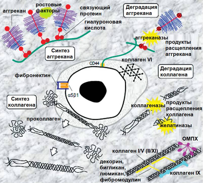 При осмотическом (гидростатическом) давлении 0,3 МРа клетками синтезируется на 20% больше протеогликанов, чем при давлении 0,1 МРа (лежа). Высокая, но даже кратковременная компрессионная нагрузка выступает катаболическим фактором: замедляет, прекращает синтез структурных белков и вызывает их распад.