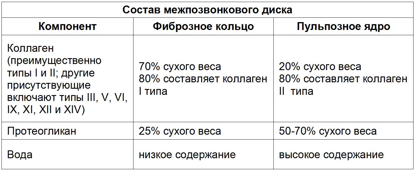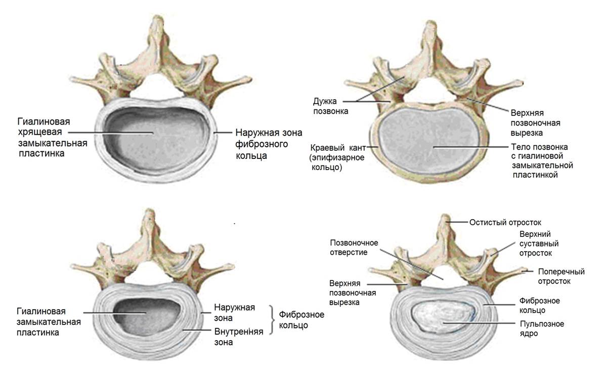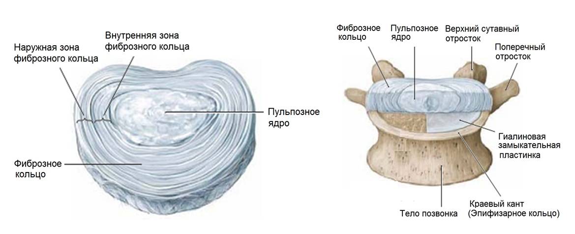 Анатомически диск состоит из трех основных составляющих: фиброзного кольца, пульпозного комплекса и верхней и нижней замыкательных пластинок.