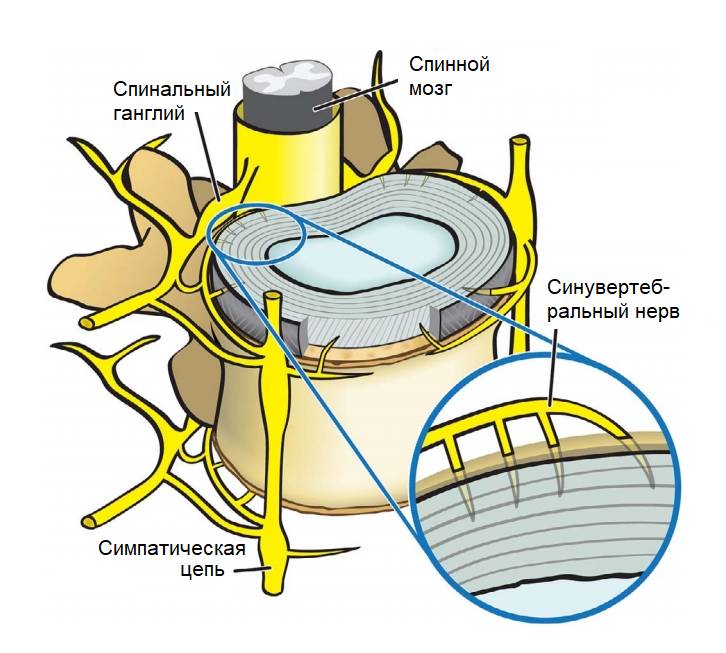 Наружные слои (ламели) состоят из строго упорядоченных волокон плотного коллагена I типа, которые вырабатываются клетками фибробластами. Каждый слой имеет свое отличное от соседних направление волокон. Питание наружных слоев фиброзного кольца осуществляется через капилляры близлежащих сосудов. Задняя и боковые части наружной части кольца хорошо иннервированы чувствительными веточками синувертебрального нерва. Передняя часть – симпатическими волокнами. Глубина иннервации может достигать 3,5 мм. Боковые части диска содержат группу различных механорецепторов, участвующих в моторном контроле через реализацию миотонических рефлексов на свою сегментарную группу мышц и паравертебральные мышцы региона.