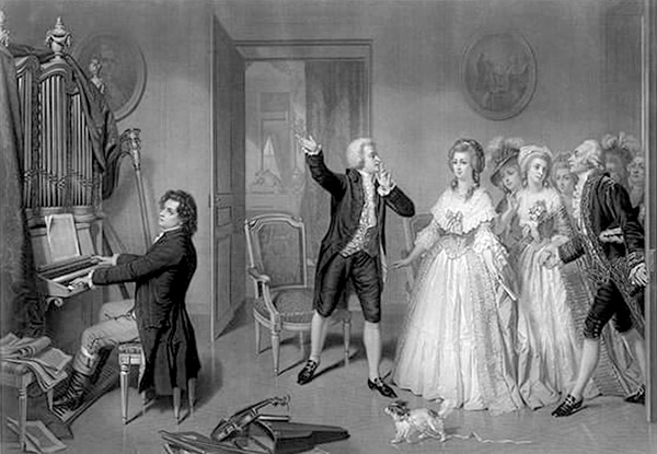 Семнадцатилетний Людвиг был принят Моцартом тоже недружелюбно; игра его на фортепиано показалась автору «Nozze» (Перед выездом в Вену Бетховен набросал для своих друзей «Элегию на смерть пуделя», заурядную грустную песенку, пролежавшую ровно сто лет в рукописи.) не более талантливой, чем многих других юных виртуозов, навещавших его; когда же Бетховен, вслед за игрой, стал на фортепиано разрабатывать экспромтом тему, заданную ему Моцартом, то последний обратился к знакомым, находившимся в соседней комнате: