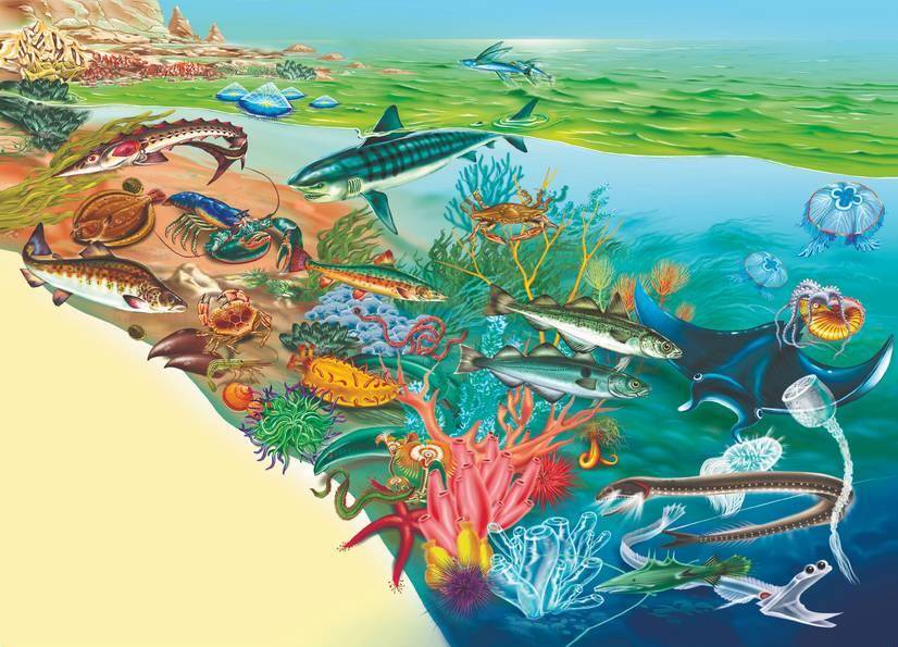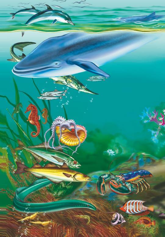 Жизнь в морских и океанических водах богата и разнообразна. В соленой воде представлены все типы животного мира, а более чем из шести десятков классов животных в воде обитает около шестидесяти.