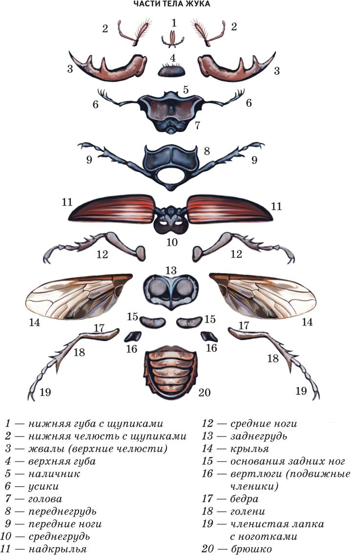 Третий признак: отдельные прочные хитиновые части соединены перепонками, обеспечивающими подвижность этих частей по отношению друг к другу. Лучше всего эта подвижность видна не у таких бронированных существ, как жуки, а, скажем, у пчел. Обратите внимание: брюшко жука и пчелы составлено из хитиновых колец, подвижных по отношению друг к другу; оно как бы имеет насечки, отсюда и название – насекомые.